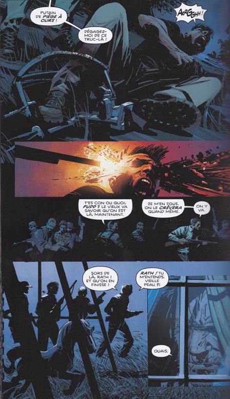 Ce dessinateur laisse une grande place aux traits rugueux pour donner de la dynamique et une ambiance empreinte d’agressivité. Néanmoins, on a parfois l’impression que Ron Garney se cherche dans son style au début de l’histoire. Cela s’arrange au fur et à mesure de l’avancée dans la lecture où il s’affirme plus avec des traits plus noirs qui correspondent à l’atmosphère générale du comics.