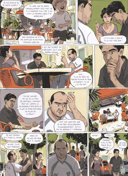 En effet, c’est en persévérant dans la lecture que j’ai été accroché par le scénario très poignant et d’actualité. J’avoue que je n’ai pas lu l’œuvre originale de Mohammed mais l’adaptation de Loïc Dauvillier m’a plongé dans cette ambiance emprunte de violence et de tensions entre les Israéliens et les Palestiniens. Le roman graphique mélange drame personnel et drame politique sans jamais prendre parti pour une idéologie.